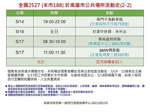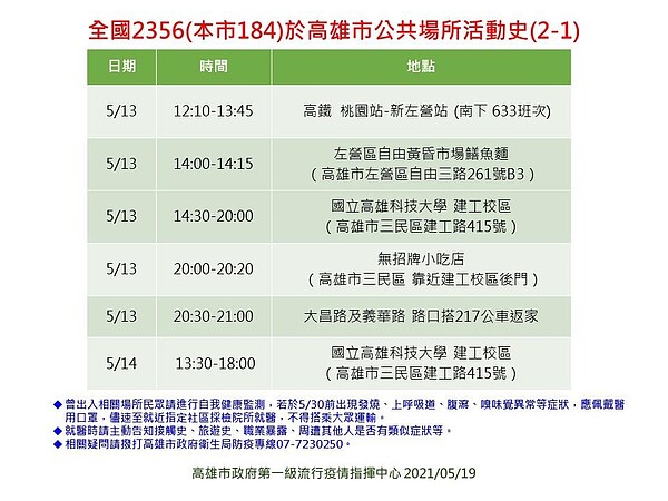 ¥å Ettodayç"æ´»æ°è Ettodayæ°èé² from cdn2.ettoday.net 快訊/高雄父子確診足跡曝!寶雅、大潤發、大樂、小北都入列 記者許宥孺/高雄報導 高雄市26日新增2例本土確診病例,分別為案5888及案5889,兩人為父子關係,是一起家庭 群聚,2案共計匡列119人。衛生局稍早公布2人活動史,包括寶雅青年店、五鳳山大潤發、 大樂購物中心、多那之青年店、小北. 一個人一天只能張貼一則新聞。 被刪或自刪也算額度內 , 超貼者退文 ,請. 目前快篩陽性者皆已送至隔離檢疫所,目前已有pulse oximeter、醫護人員進駐 >>> 中重度以上者由救護車送至醫院專責病房 >>> 輕症以徵招之防疫巴士送至集中檢疫所 在檢疫所者10天之後會再繼續做一次pcr檢測 >>> 若ct>30表示傳染力已顯著下降可以離開 >>> 若ct<30則待7. 閒聊 高雄今日+6 (確診者足跡圖) 看板 kaohsiung 作者 popoallan 時間 2周前 發表 (2021/06/24 00:19), 2周前編輯 推噓 73 (77 推 4 噓 70→) 留言 151則, 85人 參與, 2周前最新 討論串 1/1.